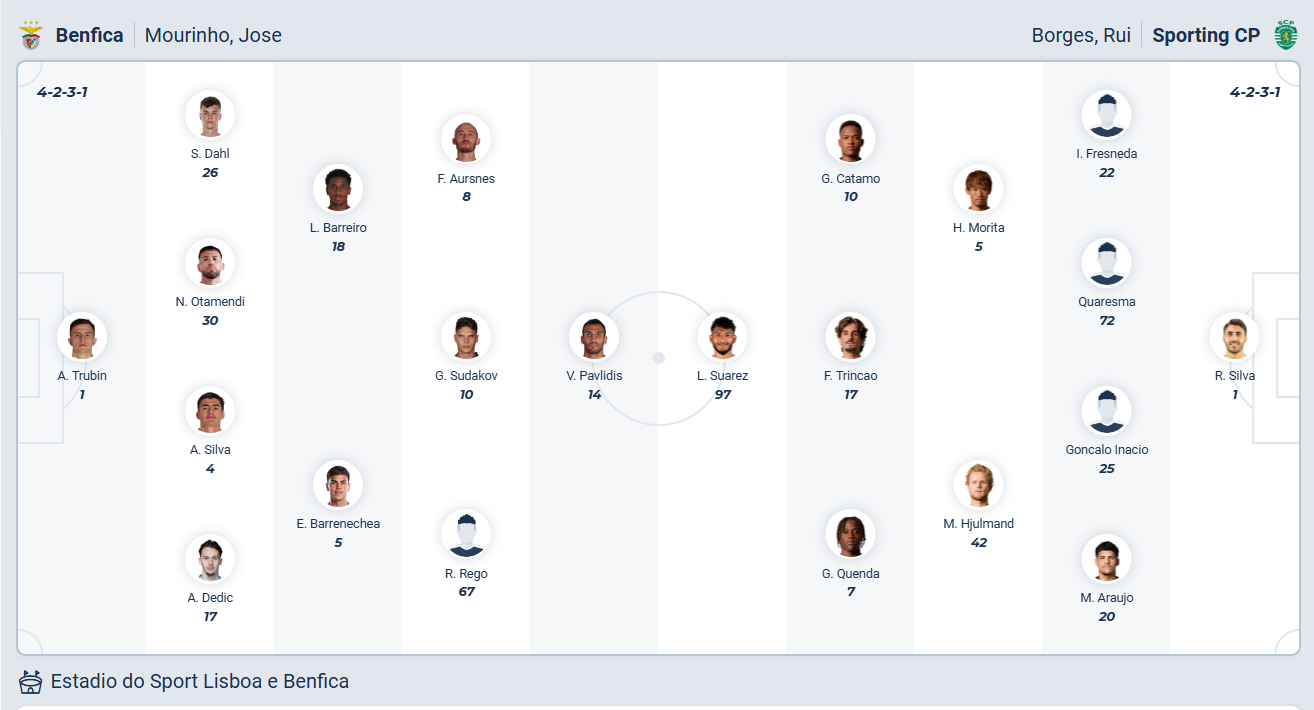 Sporting Lisbon là đội vô địch Bồ Đào Nha mùa giải trước, mùa này họ muốn bảo vệ ngôi vương nhưng trận thua duy nhất cho đến thời điểm này khiến họ đang kém Porto 3 điểm. Trong bối cảnh đội đầu bảng Porto phong độ rất ổn định thì Sporting Lisbon không còn cách nào khác ngoài việc giành chiến thắng các trận đấu của mình để bám đuổi đối thủ, mục tiêu đó không có gì khác dù đối thủ có là Benfica. Sporting Lisbon cần tận dụng tốt cơ hội thì mới có được 3 điểm trận này và nhiều khả năng dàn cầu thủ giàu kinh nghiệm sẽ giúp họ có được điều mình cần.