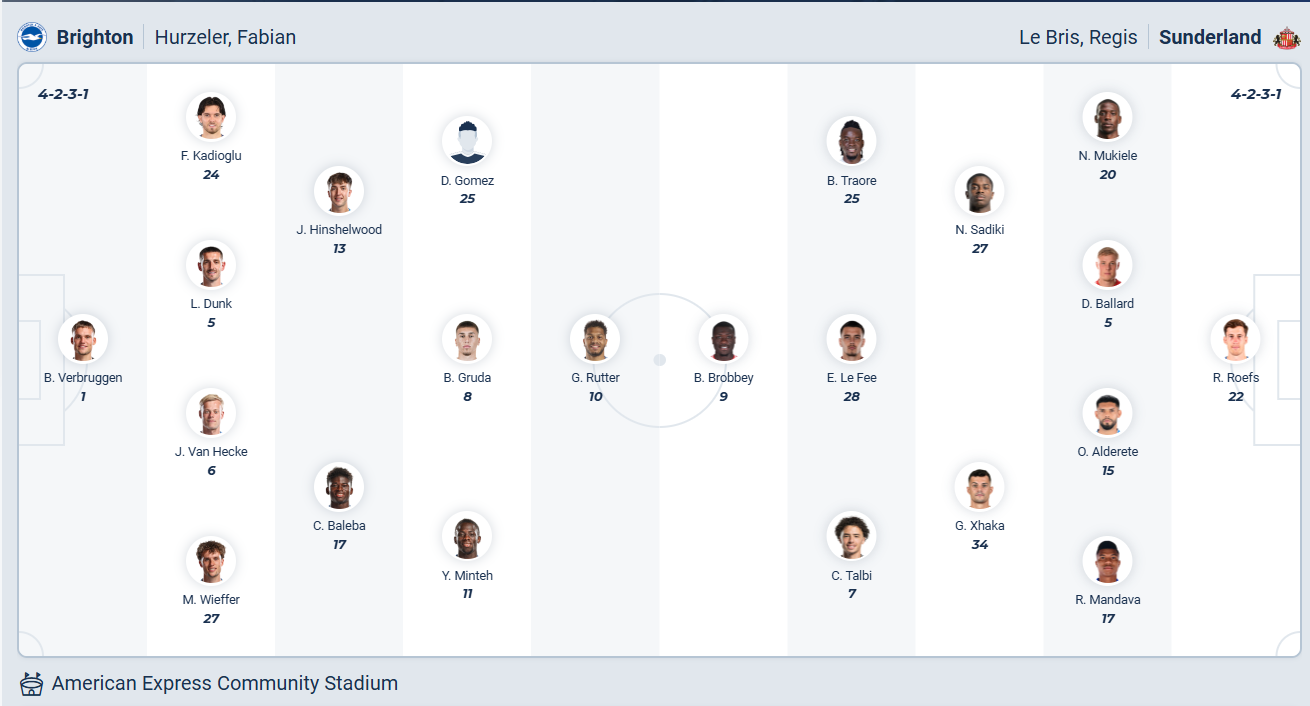 Brighton tụt xuống vị trí thứ 10 trên bảng xếp hạng sau khi chỉ có 1 điểm ở 3 trận gần nhất, đây không phải vị trí tệ của thầy trò HLV Fabian Hürzeler nhưng họ cần chặn chuỗi trận không thắng lại để tối thiểu giữ được vị trí hiện tại của mình. Họ sẽ có cơ hội làm viêc này trước Sunderland ở vòng đấu thứ 17, đối thủ không mạnh nhưng đang chơi rất ấn tượng nên đây không phải trận đấu dễ dàng. Nhiều khả năng dù gặp nhiều khó khăn nhưng các cầu thủ Brighton vẫn biết cách tận dụng được các cơ hội có được để có 3 điểm trận này.