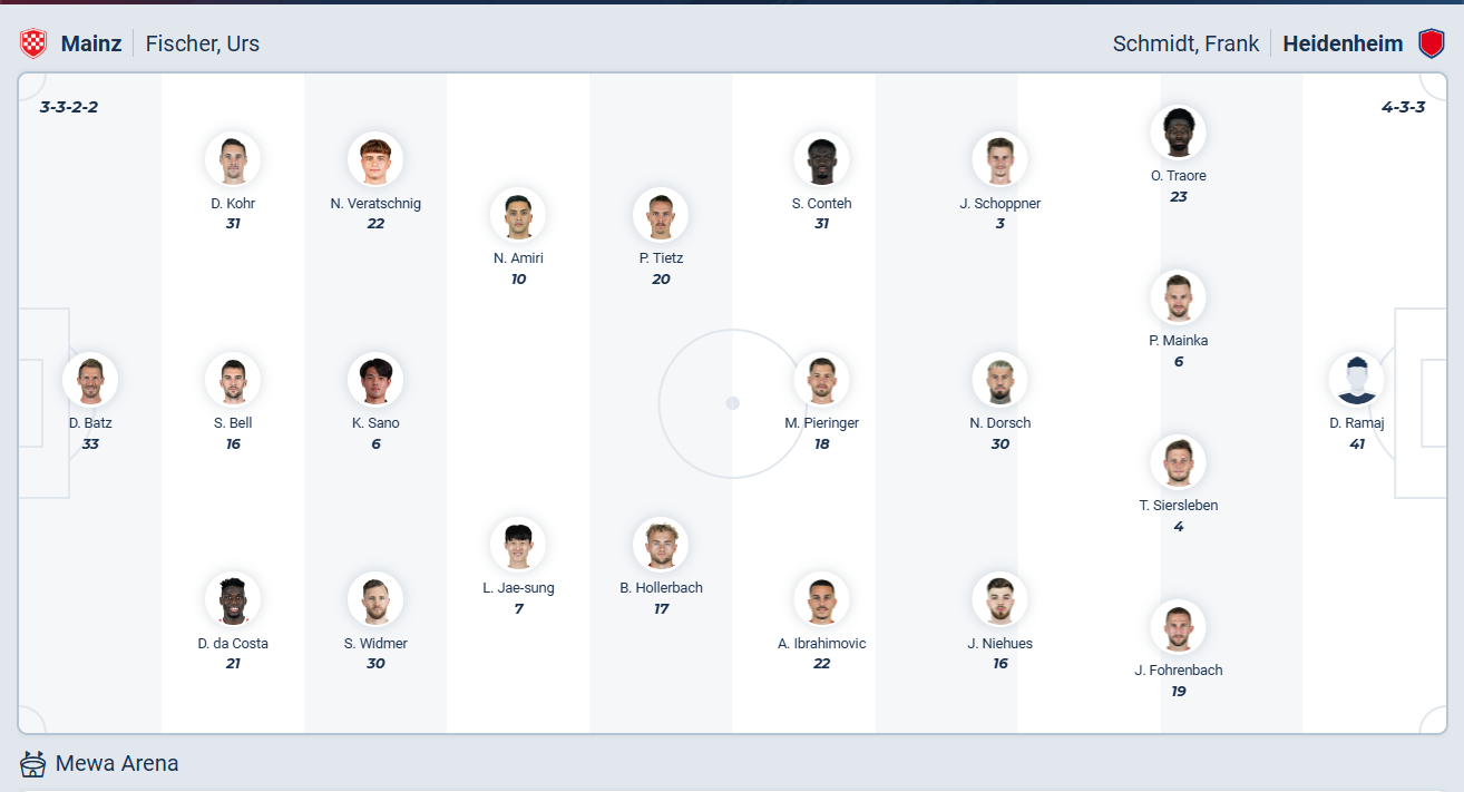 Mainz đang chơi cực tệ mùa này, họ đứng thứ 6 mùa giải trước, vị trí cho thấy đây không phải đội bóng yếu. Tuy nhiên mùa này đội bóng của HLV Urs Fischer lại đang đứng cuối bảng sau 16 vòng đấu khi mới chỉ có 9 điểm. Từ chỗ cạnh tranh cho vị trí dự cup châu Âu giờ đây các cầu thủ Mainz phải chiến đấu cho việc trụ hạng. Đây là điều rất đáng thất vọng và Mainz cần giành chiến thắng để không phải chịu một mùa giải thảm họa. Heidenheim là đối thủ dễ nhất để Mainz giành chiến thắng vào thời điểm này và rất có thể lợi thế sân nhà sẽ giúp họ đạt được mục đích.