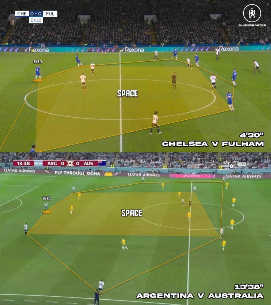 Argentina gặp khó trong giai đoạn triển khai bóng trước khối 4-4-2 kín kẽ của Australia. Bóng không thể được đưa vào khu vực giữa sân cho Enzo, Mac Allister và De Paul. Hướng thoát duy nhất cho quả bóng là hướng ra hai biên cho Molina và Acuna. Để giải quyết, Enzo quyết định lùi xuống giữa cặp trung vệ và một khoảng trống mênh mông giữa hai tuyến xuất hiện. Nghe quen chứ?